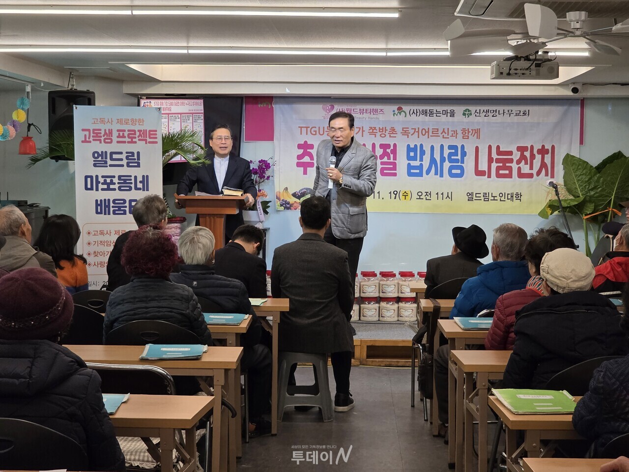 이날 (사)해돋는마을 장민욱 사무총장(신생명나무교회 전도사)의 사회로 진행된 밥사랑잔치에 TTGU 총동문회 회장 김병준 목사는 “추수감사절을 맞아 사랑의 밥퍼로 독거어르신분들을 섬길 수 있어 기쁘다며 천국소망 갖고 더욱 건강하셔서 내년에도 뵐 수 있도록 영육의 강건하시기를 바란다”고 전했다.