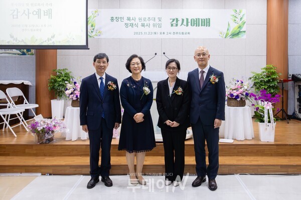 전주드림교회가 11월 22일(토) 오후 2시 본당에서 목사 위임 및 원로목사 추대 감사예배를 드리고, 정재식 목사를 새 담임목사로 세우며 홍창민 목사를 원로로 추대했다. 예배는 지역 목회자와 성도들이 함께한 가운데 하나님께 감사와 영광을 올리며 차분하고 은혜롭게 진행됐다.